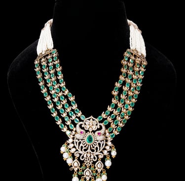 Jewelry has always been more than just an accessory — it’s a statement of tradition, elegance, and identity. The necklace set pictured above is a fine example of Indian craftsmanship, blending royal design, premium gemstones, and intricate detailing into one magnificent piece. Designed to complement grand occasions like weddings, engagements, and festive celebrations, this set radiates a charm that is both timeless and contemporary.