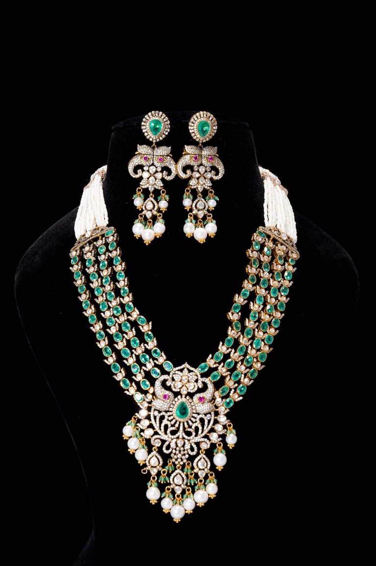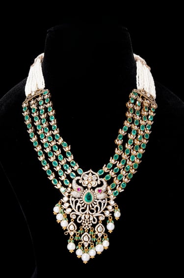 At the center lies an elaborate pendant adorned with flawless white stones and delicate pearls, giving the design a regal touch. The pearl drops at the bottom add movement and grace, perfectly complementing the grandeur of the emerald layers.