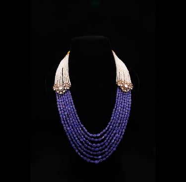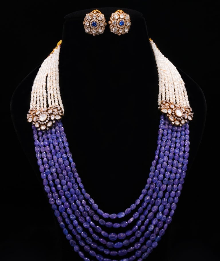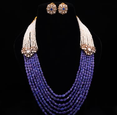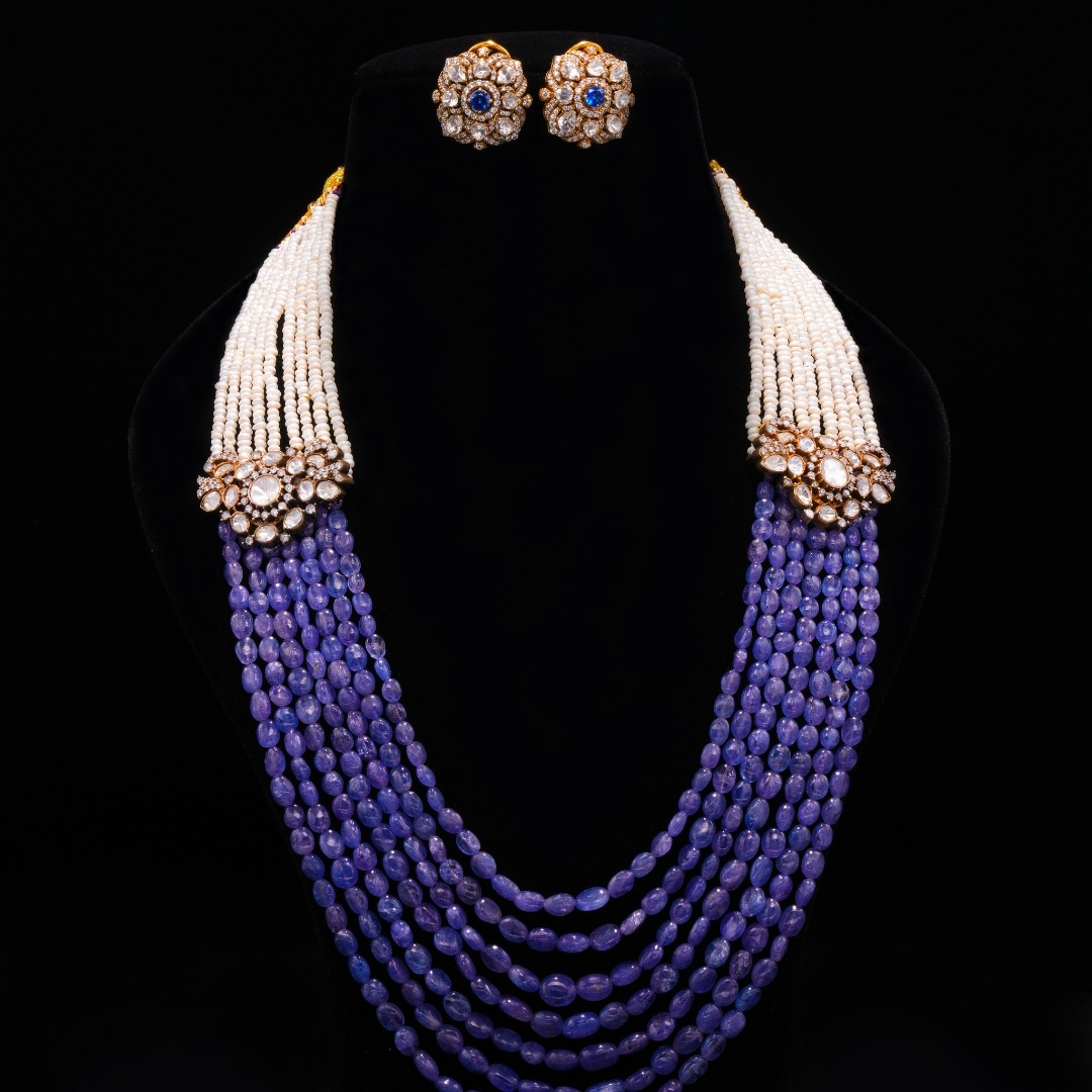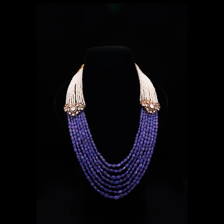 The necklace is designed with layers of lustrous pearls and violet gemstone beads, cascading in harmony to create a striking visual impact. The upper section begins with clusters of fine white pearls, symbolizing purity, elegance, and timeless tradition. These pearls transition seamlessly into strands of violet gemstones, polished to perfection, giving the necklace its modern yet regal charm.