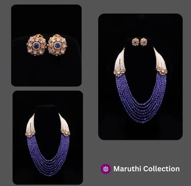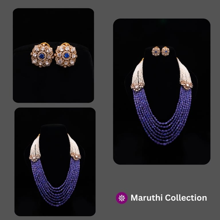 Maruthi Collection Jewelry continues to redefine the way tradition and modernity come together. This pearl and violet gemstone necklace set is a testament to their philosophy—where jewelry is not just worn but experienced as a piece of art and heritage. Whether for a bride, a collector, or a woman who values elegance in every detail, this set is a timeless treasure.