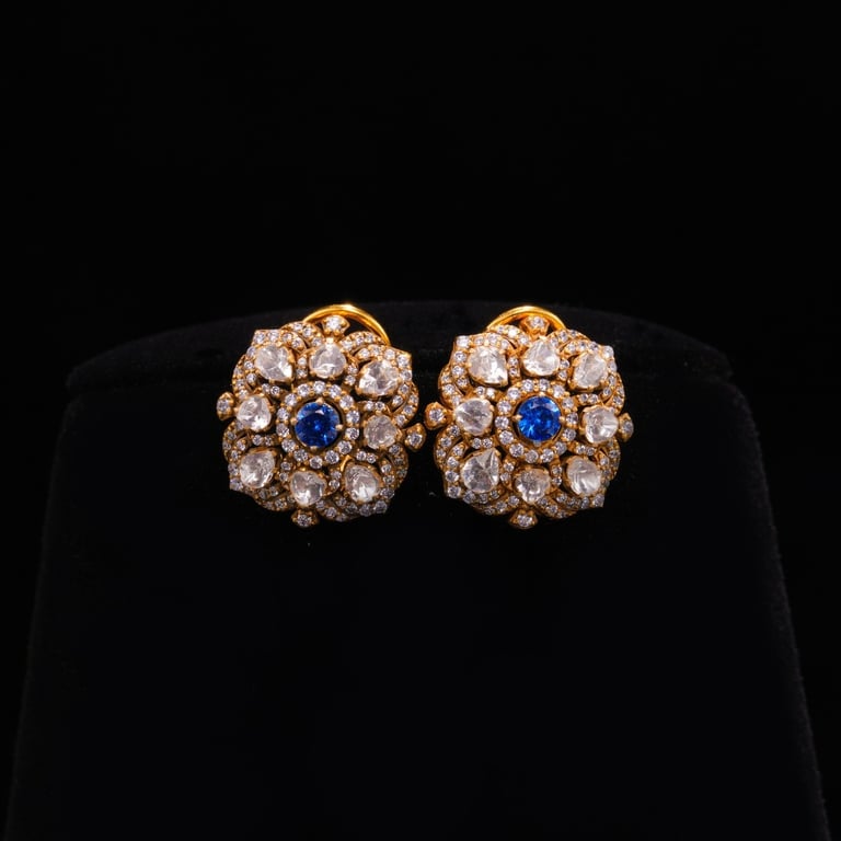 Complementing the grandeur of the necklace, the set includes a pair of stud earrings shaped like blooming flowers. Crafted with shimmering white stones around a deep blue centerpiece, the earrings reflect a sense of understated luxury. Lightweight yet regal, they balance the heavy necklace, ensuring the set remains elegant without overwhelming the wearer.