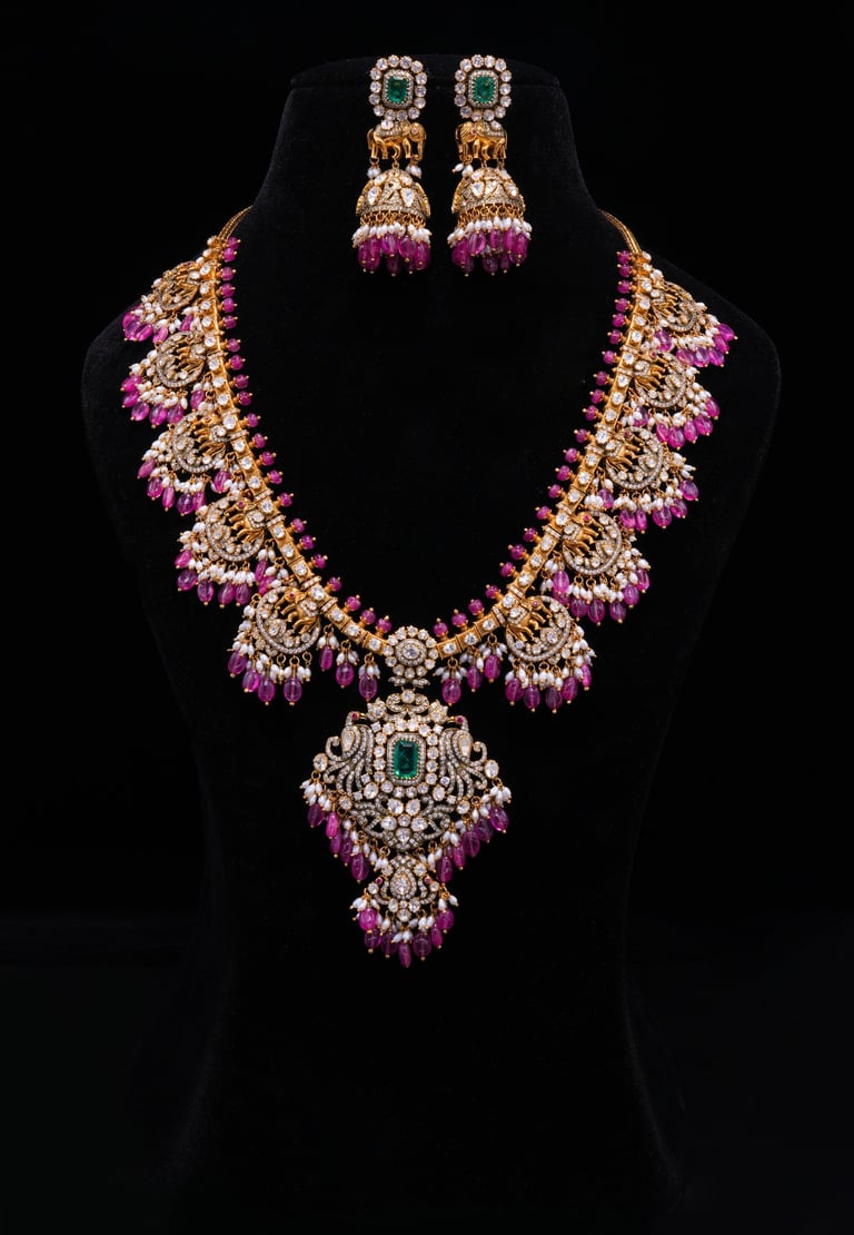 Adding a vibrant touch, delicate ruby drops and pearl accents frame the entire necklace, creating a graceful balance of color and sparkle. The matching earrings, featuring elephant motifs with ruby and pearl jhumkis, complete the set with regal charm. Each detail reflects painstaking artistry, making this set a true heirloom piece.