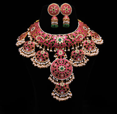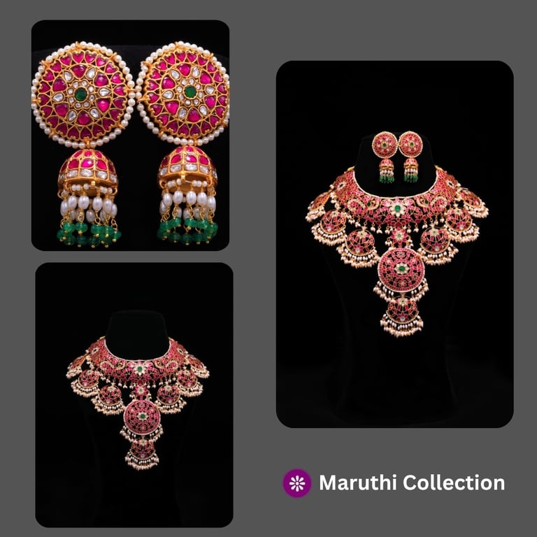 Every jewel has a story — a story of art, culture, and passion. The Royal Heritage Kundan Necklace Set by Maruthi Collections jewelry is one such story brought to life through the skillful hands of expert artisans. With its bold design, radiant colors, and intricate detailing, this necklace set embodies the essence of Indian royalty and timeless craftsmanship.