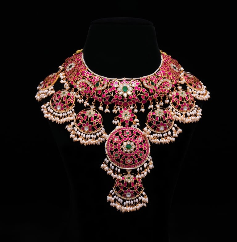 - Gemstone and Pearl Embellishment: The necklace is adorned with high-quality ruby, emerald, and American diamond stones, giving it its unmistakable sparkle. Tiny natural freshwater pearls are then added around each motif, enhancing the necklace’s texture and royal appeal.